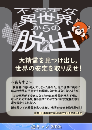 ・本コンテンツは『謎キャン2026』内で開催されるコンテンツです。参加するためには本コンテンツのチケットの他に、『謎キャン2026』への入場チケットが必要です。入場チケットはこちら(https://escape.id/org/nazocam2026/event/nazocam_entry/) でお買い求めいただけます。